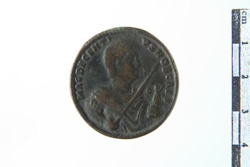 Busto paludato di Decenzio a d., recante asta e globo niceforo
