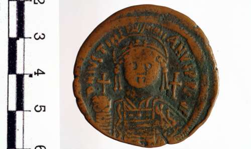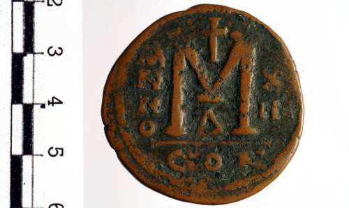 Busto frontale, elmato e corazzato, di Giustiniano I con globo crucigero e scudo; a d., croce