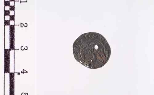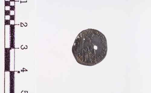 Il Doge con berretto e manto, inginocchiato a s., tiene con ambo le mani il vessillo.