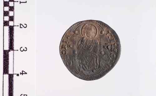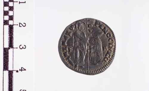 S. Marco con nimbo di perline, in piedi a s., porge con la d. il vessillo al Doge genuflesso, che lo prende con ambo le mani,sulla banderuola volta a d., forse è indicato un piccolo leone alato.