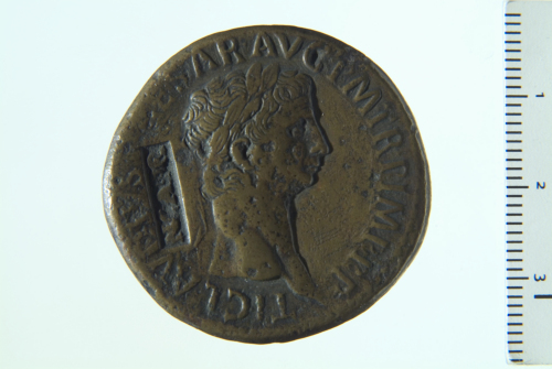 Testa laureata di Claudio a d.; contorno perlinato