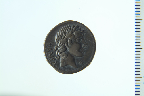 Testa laureata di Apollo a d.; contorno perlinato
