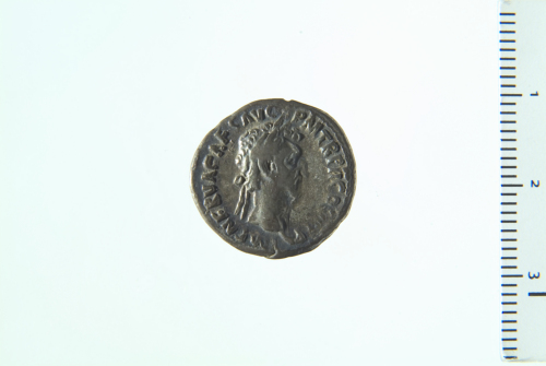 Testa laureata di Nerva a d.; contorno perlinato.