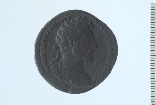 Busto laureato e corazzato di Marco Aurelio a d.; contorno perlinato.