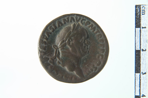 testa laureata di Vespasiano a d.