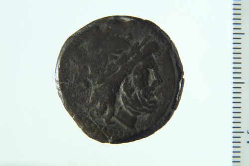 Testa laureata di Saturno a d.; contorno perlinato