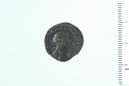 Busto laureato di Traiano a d., drappeggiato sulla spalla s., di tre quarti in avanti; contorno perlinato.