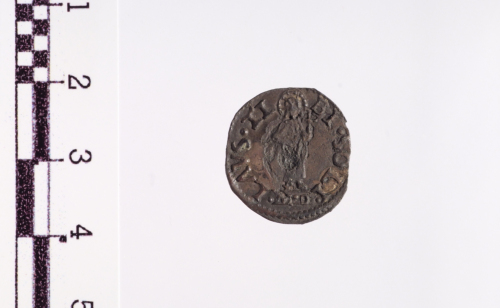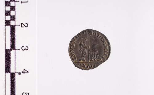 San Marco stante a s. porge porge il vessillo al Doge genuflesso che lo prende con ambo le mani, lungo l'asta del vessillo D/V/X