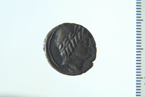 Testa di Apollo con corona di quercia a d., in basso fulmine; contorno perlinato
