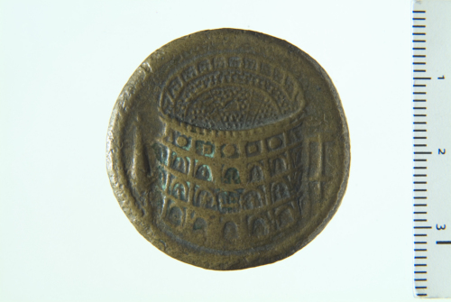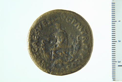 Tito seduto a s., reggente ramo nella d. protesa; attorno, armi; contorno perlinato.