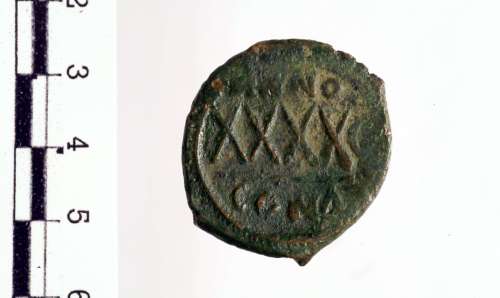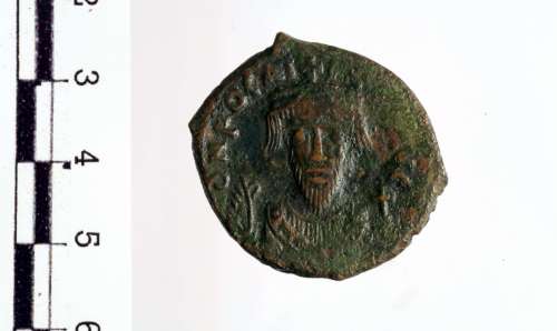 Busto frontale, con veste consolare e corona con croce, di Foca che tiene una mappa e una croce; a s., stella