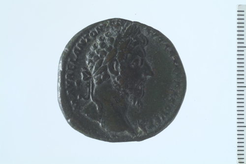 Testa laureata di Marco Aurelio a d.; contorno perlinato.