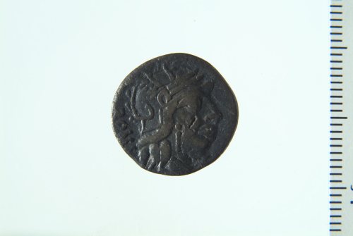 Testa di Roma elmata a d.; contorno perlinato