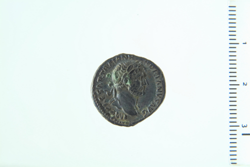 Busto laureato di Adriano a d., drappeggiato sulla spalla s.; contorno perlinato.