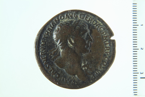 Busto laureato di Traiano d., con egida; contorno perlinato.