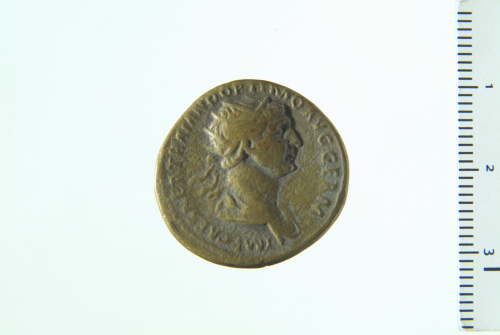 Busto radiato di Traiano a d.,con paludamentum; contorno perlinato.