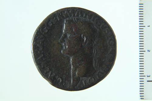 Testa laureata di Caligola a s.; contorno perlinato