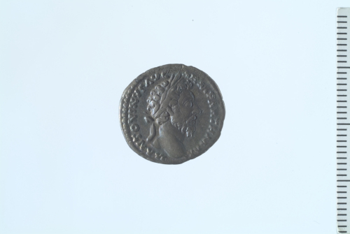 Testa laureata di Marco Aurelio a d.; contorno perlinato.