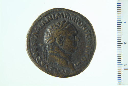 Testa laureata di Tito a d.; contorno perlinato.