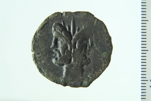 Testa barbata di Giano bifronte; contorno perlinato