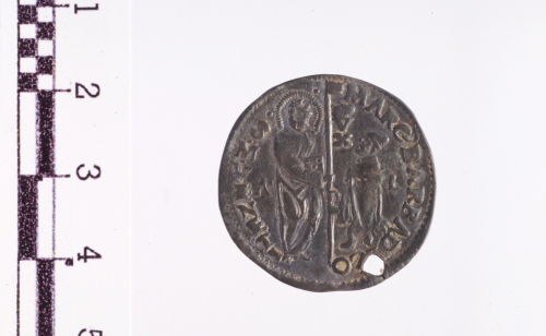 San Marco nimbato a s. consegna il vessillo al doge inginocchiato a d. che lo riceve con ambo le mani, tra lettere A e L