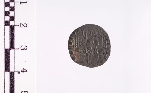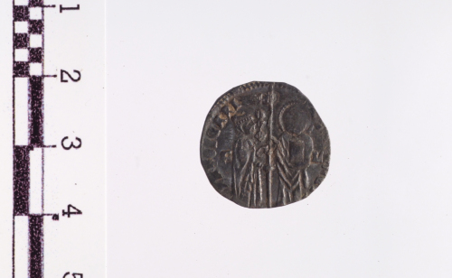 Due figure stanti. A d. San Marco porge il vessillo al Doge a s., lungo l'asta D/V/X; nel campo fra le figure e la legenda le lettere F e L