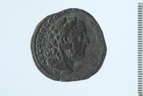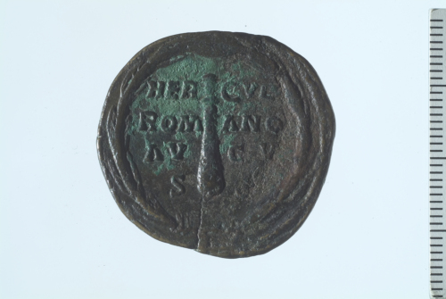 Testa di Commodo con pelle di leone a d.; contorno perlinato.