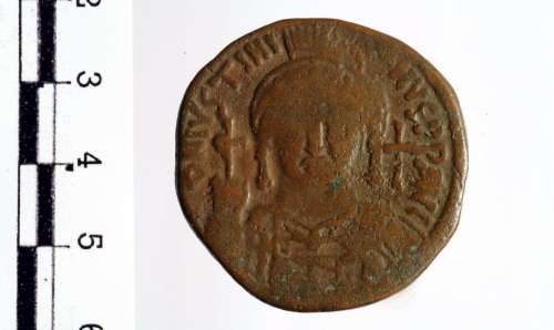 Busto frontale, elmato e corazzato, di Giustiniano I con globo crucigero e scudo; a d., croce