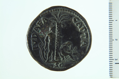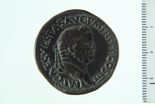 Testa laureata di Vespasiano a d.; contorno perlinato.