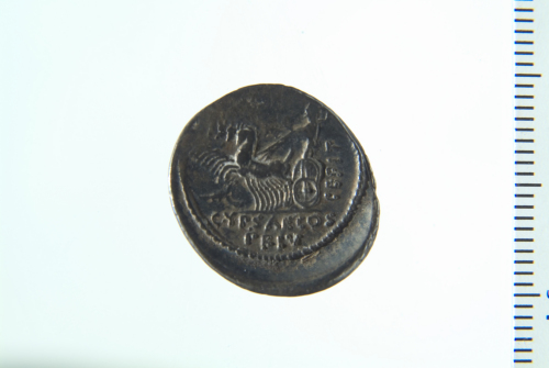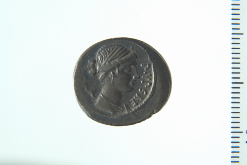 Busto di Leuconoe drappeggiato e ornato di gioielli a d., a s. delfino; contorno perlinato
