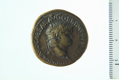 Testa laureata di Nerone a d.; in basso a d., in corrispondenza del taglio del collo, globetto(?); contorno perlinato.