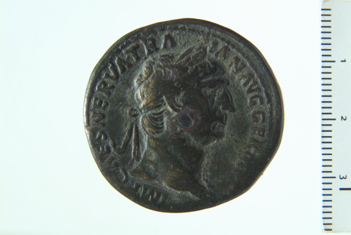 Busto laureato di Traiano d.; contorno perlinato.