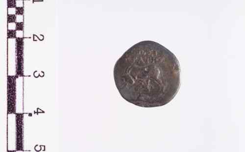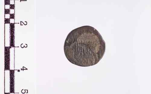 Vacca, stante a s., che allatta un vitello; in esergo: un grappolo d'uva