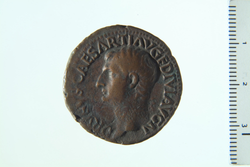 Testa laureata di Druso minore a s.; contorno perlinato