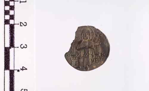 S. Marco in piedi a d. porge il vessillo al Doge a s. in piedi.
