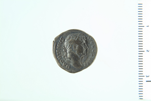Testa laureata di Adriano a d.; contorno perlinato.