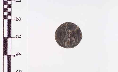 S. Marco nimbato a s., in piedi, in abito sacerdotale col Vangelo nella s., volto di tre quarti a d., riceve nella d. dal Doge, con berretto e manto ducale, in piedi, a d. volto di profilo a s., un cero, che gli porge con ambo le mani.