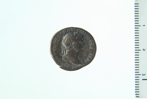 Busto laureato di Traiano a d., drappeggiato sulla spalla s.; contorno perlinato (?).