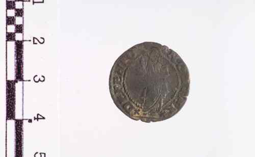 Sopra linea orizzontale: a s. il leone alato e nimbato, in piedi a d., con la testa di fronte e la zampa s. anteriore sul libro aperto; a d. il Doge genuflesso, rivolto al leone, tiene con ambe le mani il vessillo sormonato da croce e con banderuola a d.; cerchio di perline.