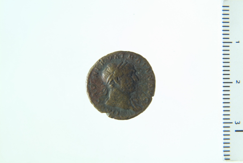 Busto laureato di Traiano d., drappeggiato sulla spalla s.; contorno perlinato (?).