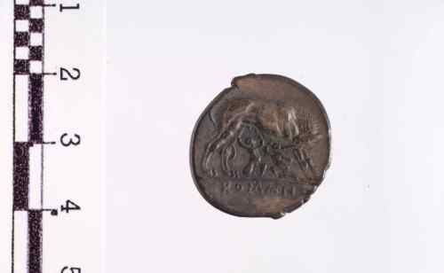 Testa di Ercole a d., con nastro nei capelli, pelle di leone legata al collo. Intorno cerchio di puntini.