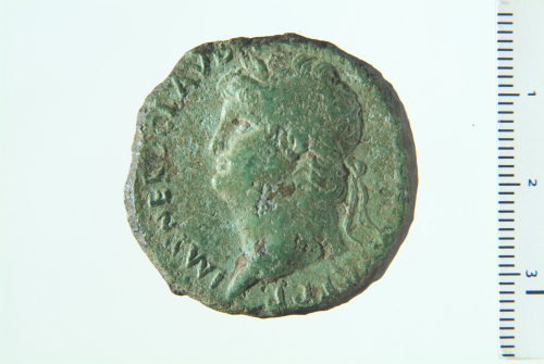 Testa laureata di Nerone a s.; contorno perlinato.