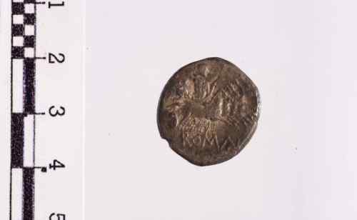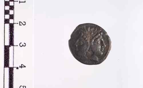 Testa gianiforme, laureata dei Dioscuri. Cerchio di puntini.