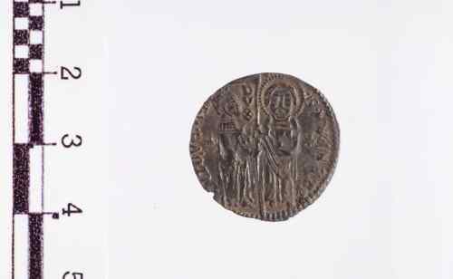 S. Marco a d., in piedi di fronte, porge il vessillo al Doge a s. volto di profilo a d.