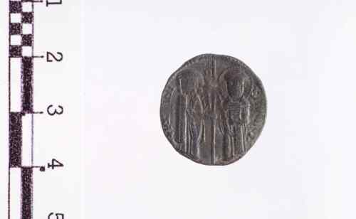 S. Marco nimbato e barbato in piedi a d. di fronte, tiene con la s. il libro dei Vangeli e con la d. porge il vessillo al Doge barbato in piedi, a s., di fronte. Il Doge indossa un ricco manto gemmato, tiene con la s. un rotolo (volumen) e con la d. regge il vessillo, la cui banderuola , con croce, è volta a s.