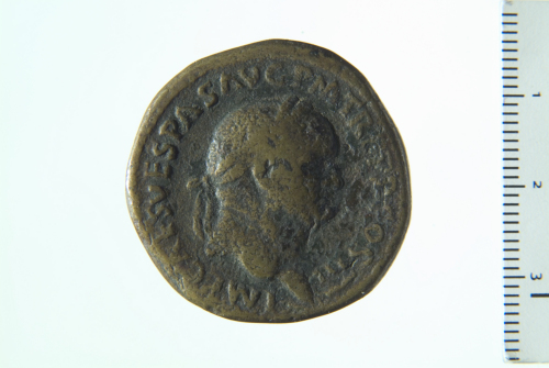 Testa laureata di Vespasiano a d.; contorno perlinato.