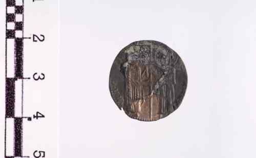S. Marco in piedi a d. porge il vessillo al Doge a s. in piedi.
