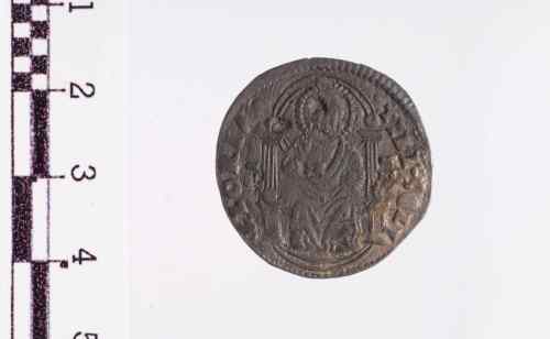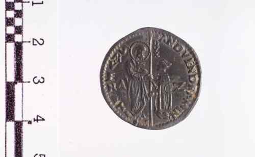 S. Marco, in piedi a s., porge il vessillo al Doge genuflesso che lo prende con ambo le mani.