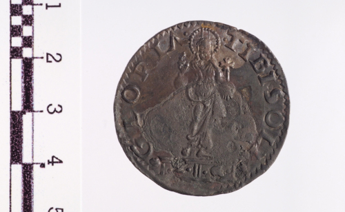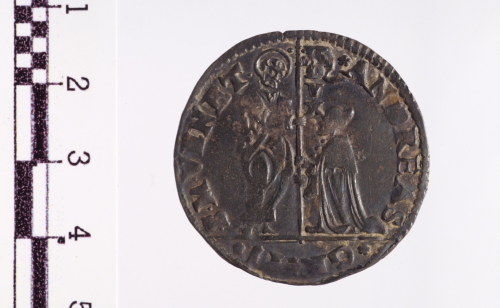 San Marco stante a s. porge il vessillo al doge genuflesso a d. che lo prende con ambo le mani; lungo lasta D/V/X, sulla banderuola leone gradiente a s.