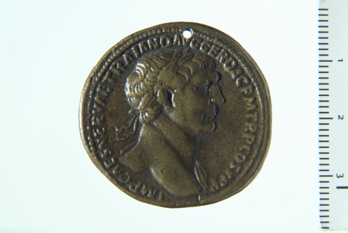 Busto laureato di Traiano d., drappeggiato sulla spalla s.; contorno perlinato.